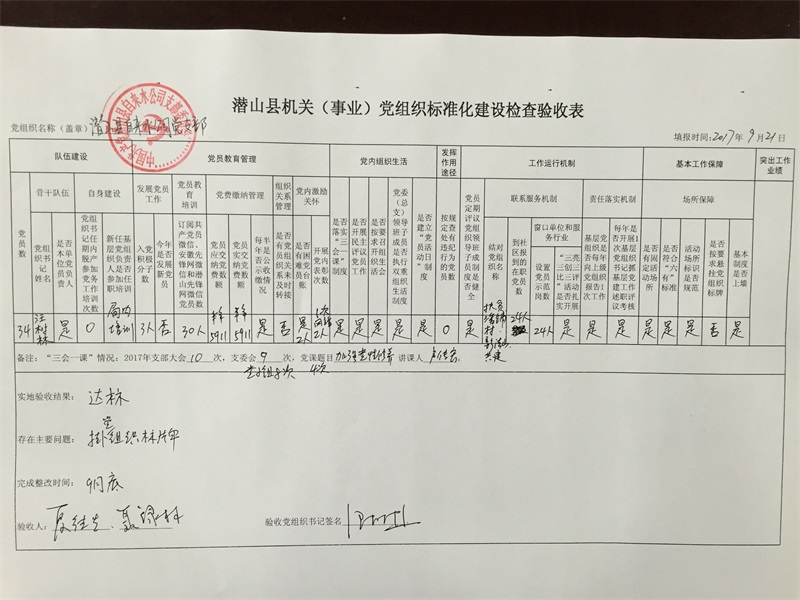 9月21日,基層黨組織標(biāo)準(zhǔn)化檢查驗(yàn)收小組第三組成員夏德生、聶綠林與住建局黨總支相關(guān)人員對(duì)公司黨支部的基層黨組織標(biāo)準(zhǔn)化建設(shè)的相關(guān)工作進(jìn)行檢查 驗(yàn)收,公司支部書記汪樹林、宣傳委員房春陽陪同。檢查組查閱了公司支部有關(guān)隊(duì)伍建設(shè)、黨員教育管理、黨內(nèi)組織生活、工作運(yùn)行機(jī)制等相關(guān)材料,了解了公司黨組織建設(shè)的基本情況,并在查閱相關(guān)材料后實(shí)地查看公司黨員活動(dòng)室的建設(shè)情況。此次實(shí)地檢查驗(yàn)收結(jié)果為達(dá)標(biāo)。檢查組對(duì)公司的標(biāo)準(zhǔn)化建設(shè)工作予以肯定,尤其是對(duì)黨員學(xué)習(xí)常態(tài)化、三會(huì)一課的扎實(shí)開展、黨員活動(dòng)日活動(dòng)的開展給予好評(píng)。同時(shí),檢查組也提出了對(duì)公司黨組織建設(shè)的建議,如相關(guān)工作材料須整理地更有邏輯性,并按要求規(guī)范懸掛黨組織標(biāo)牌。