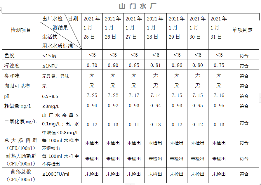2021年1月25日-31日出廠水水質(zhì)日檢指標(biāo)公告