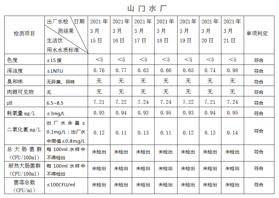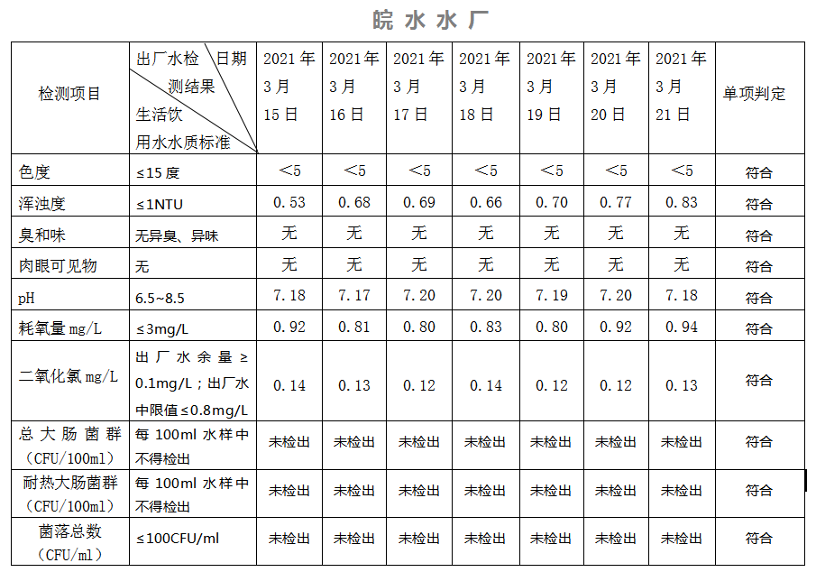 2021年3月15日-21日出廠水水質(zhì)日檢指標公告