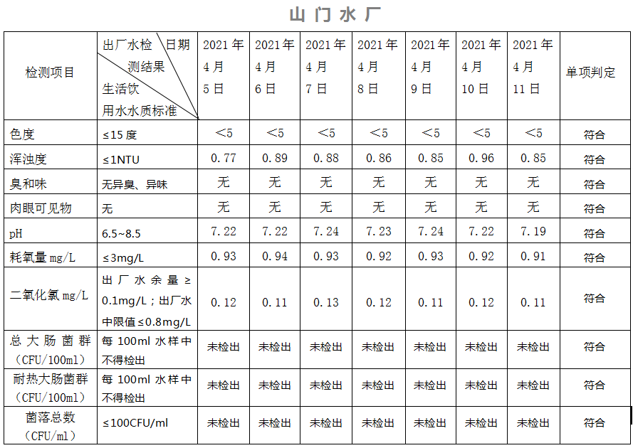 2021年4月5日-11日出廠水水質(zhì)日檢指標公告