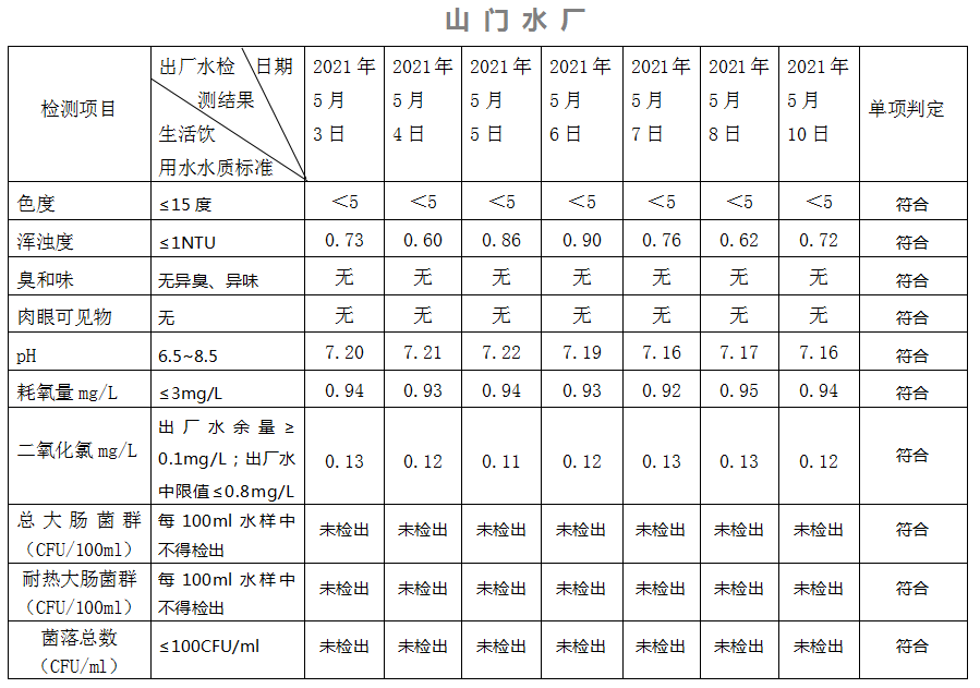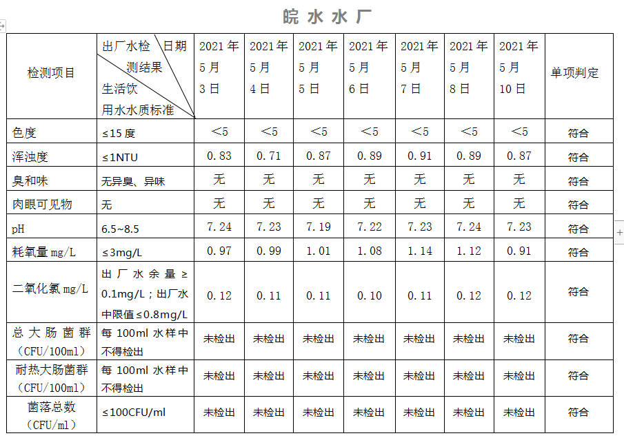 2021年5月3日-10日出廠水水質(zhì)日檢指標(biāo)公告