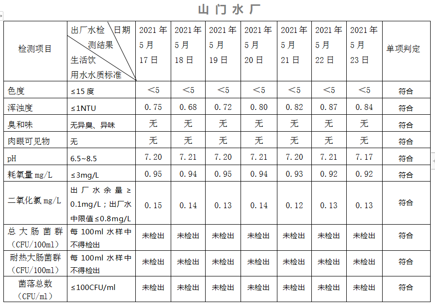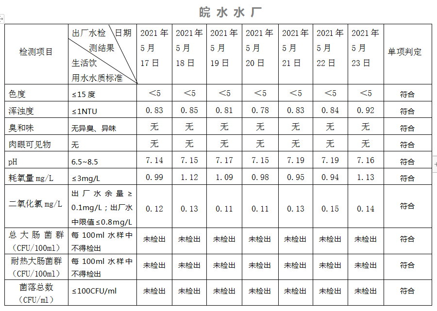 2021年5月17日-23日出廠水水質(zhì)日檢指標(biāo)公告