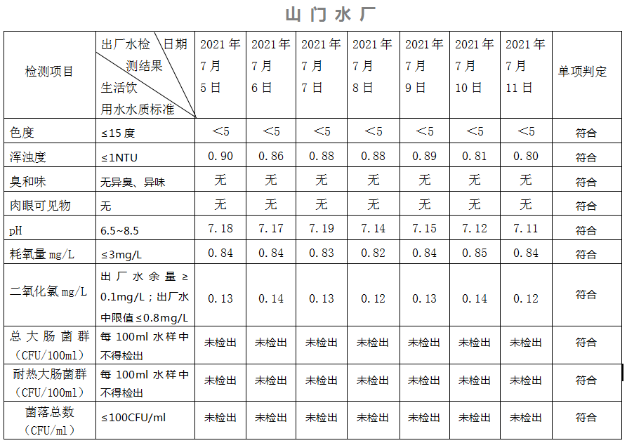 2021年7月5日-11日出廠水水質(zhì)日檢指標(biāo)公告
