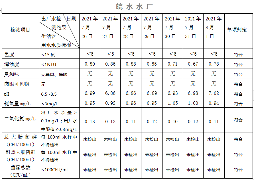 2021年7月26日-8月1日出廠水水質(zhì)日檢指標(biāo)公告