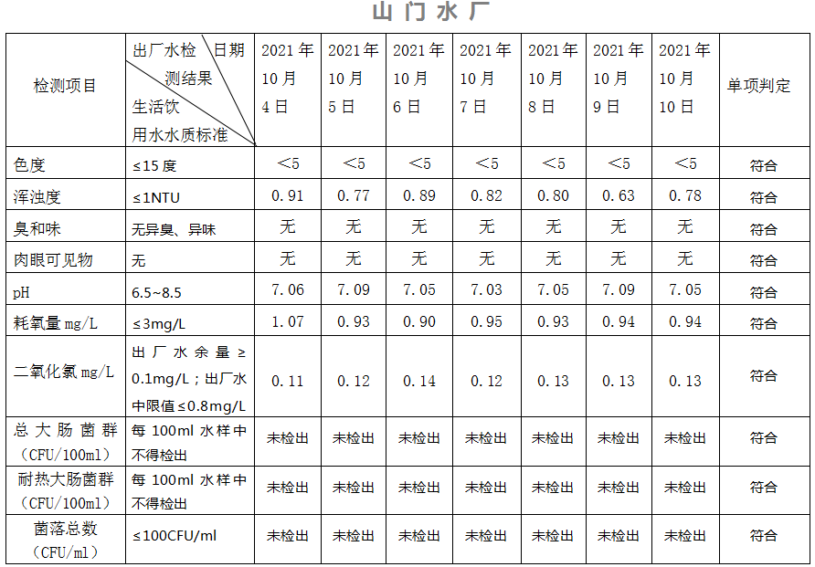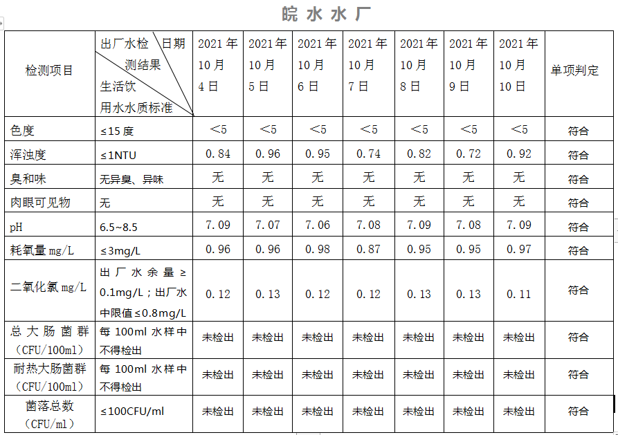 2021年10月4日-10日出廠水水質(zhì)日檢指標(biāo)公告