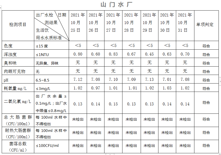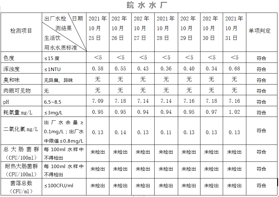 2021年10月25日-31日出廠水水質(zhì)日檢指標(biāo)公告