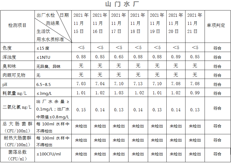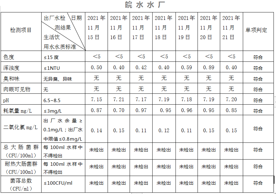 2021年11月15日-21日出廠水水質日檢指標公告