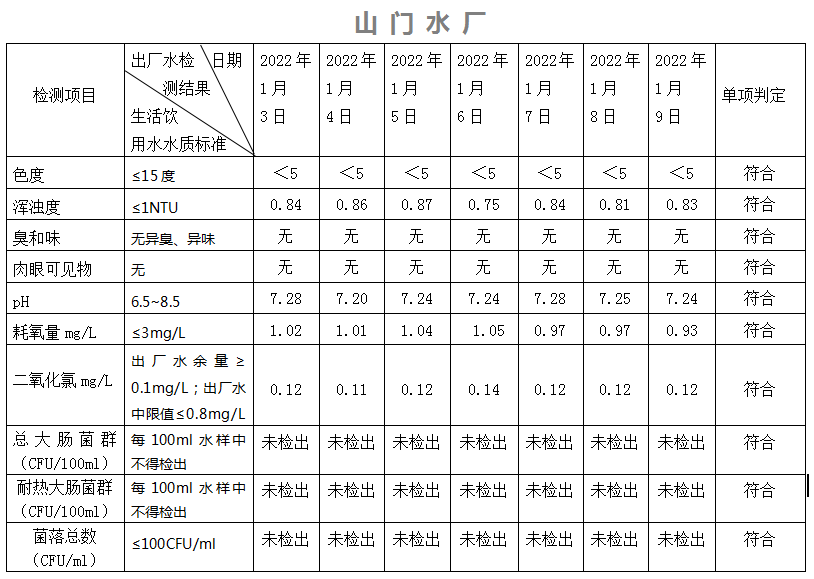 2022年1月3日-9日出廠水水質(zhì)日檢指標(biāo)公告