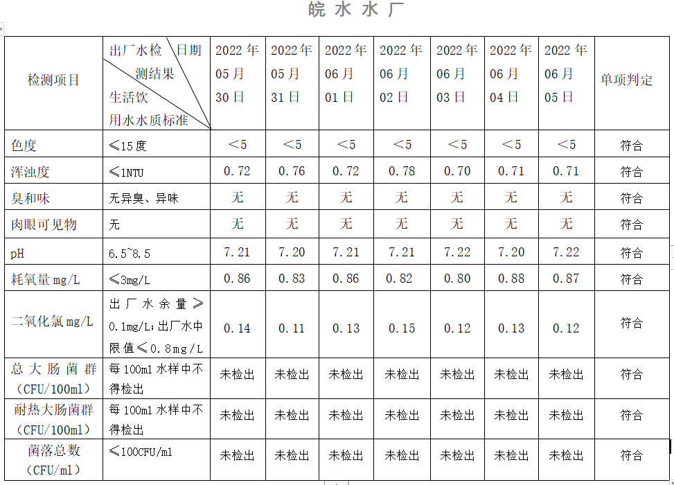 2022年5月30日-6月5日出廠水水質(zhì)日檢指標(biāo)公告