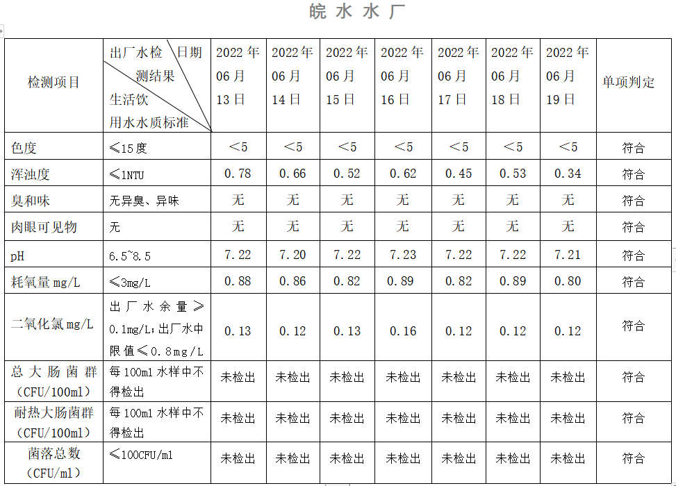 2022年6月13日-6月19日出廠水水質(zhì)日檢指標(biāo)公告