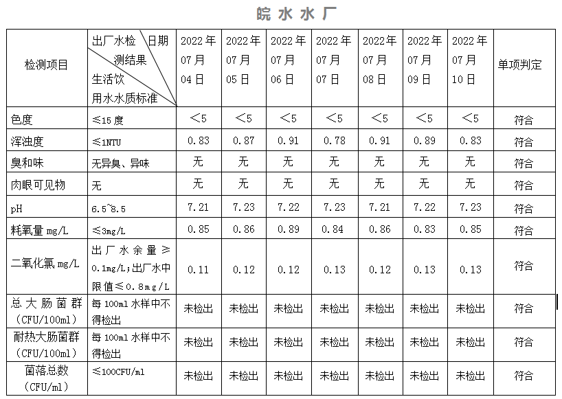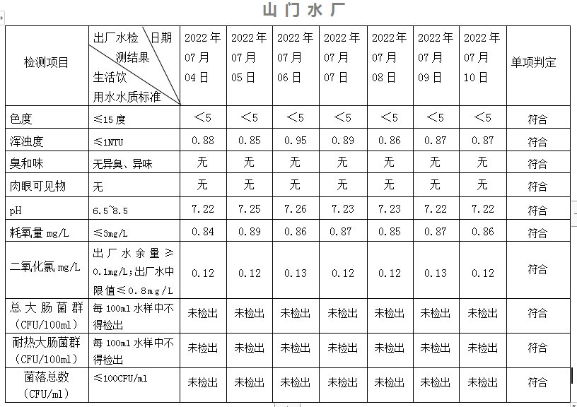 2022年7月4日-7月10日出廠水水質日檢指標公告