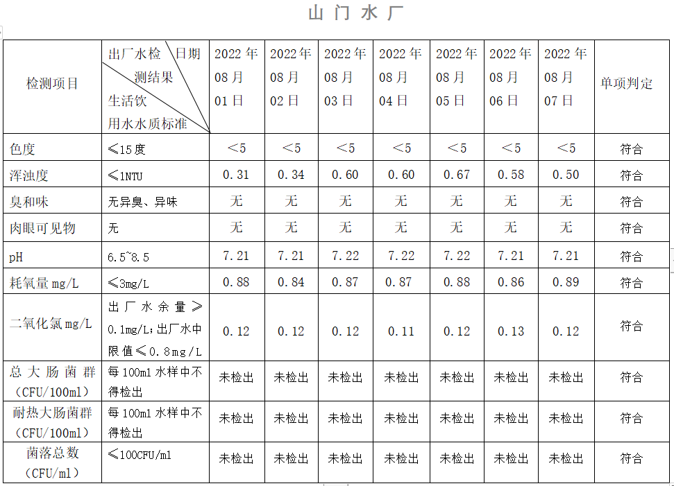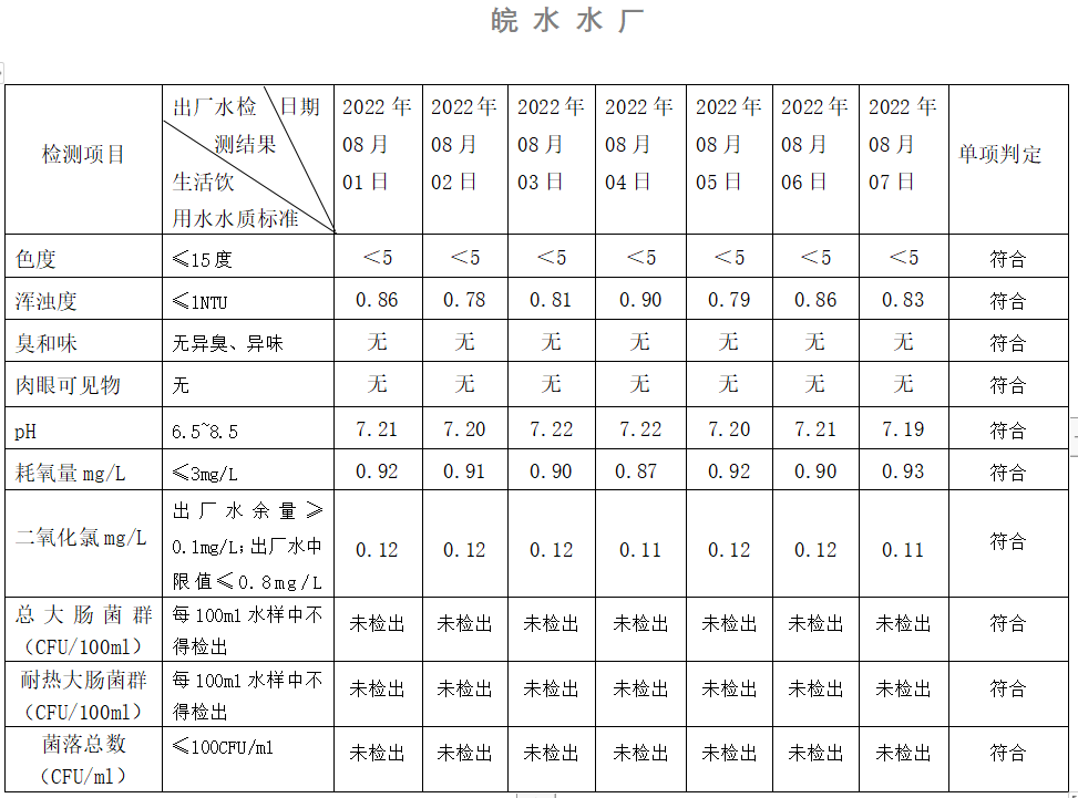 2022年08月01日-08月07日出廠水水質(zhì)日檢指標(biāo)公告