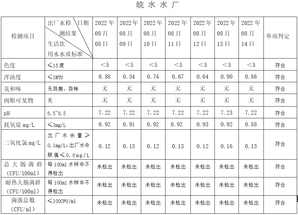2022年8月08日-8月14日出廠水水質(zhì)日檢指標(biāo)公告
