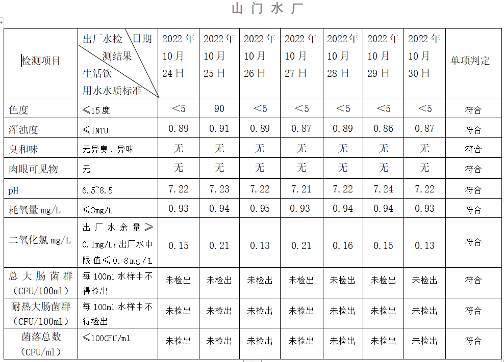 2022年10月24日-10月30日出廠水水質(zhì)日檢指標(biāo)公告