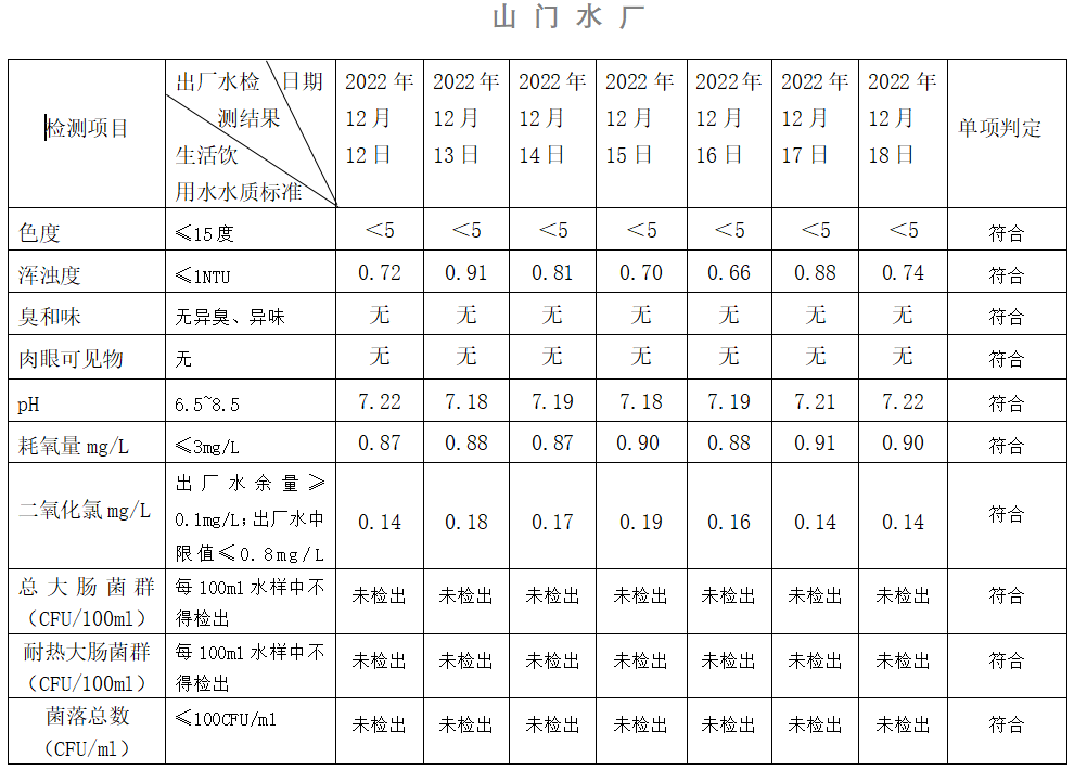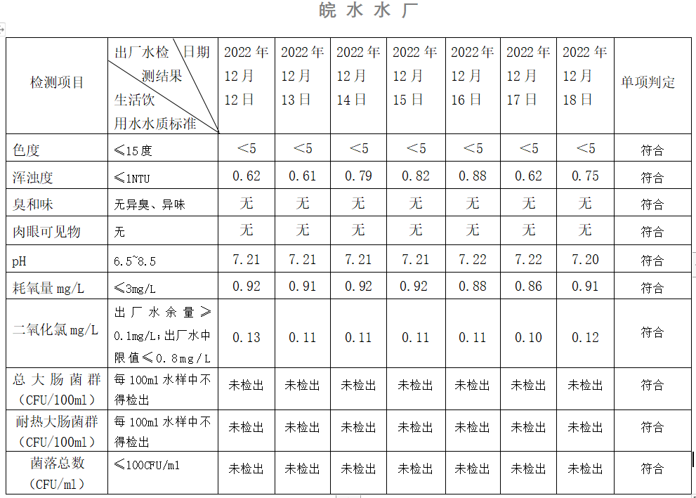 2022年12月12日-12月18日出廠水水質(zhì)日檢指標公告