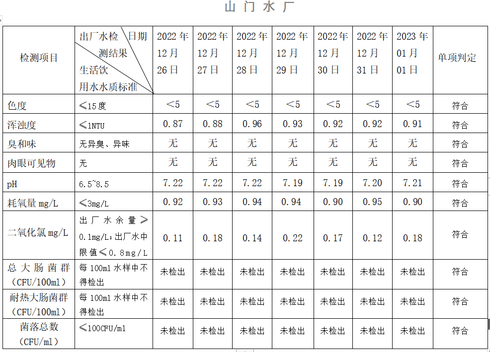 2022年12月26日-2023年1月1日出廠水水質(zhì)日檢指標(biāo)公