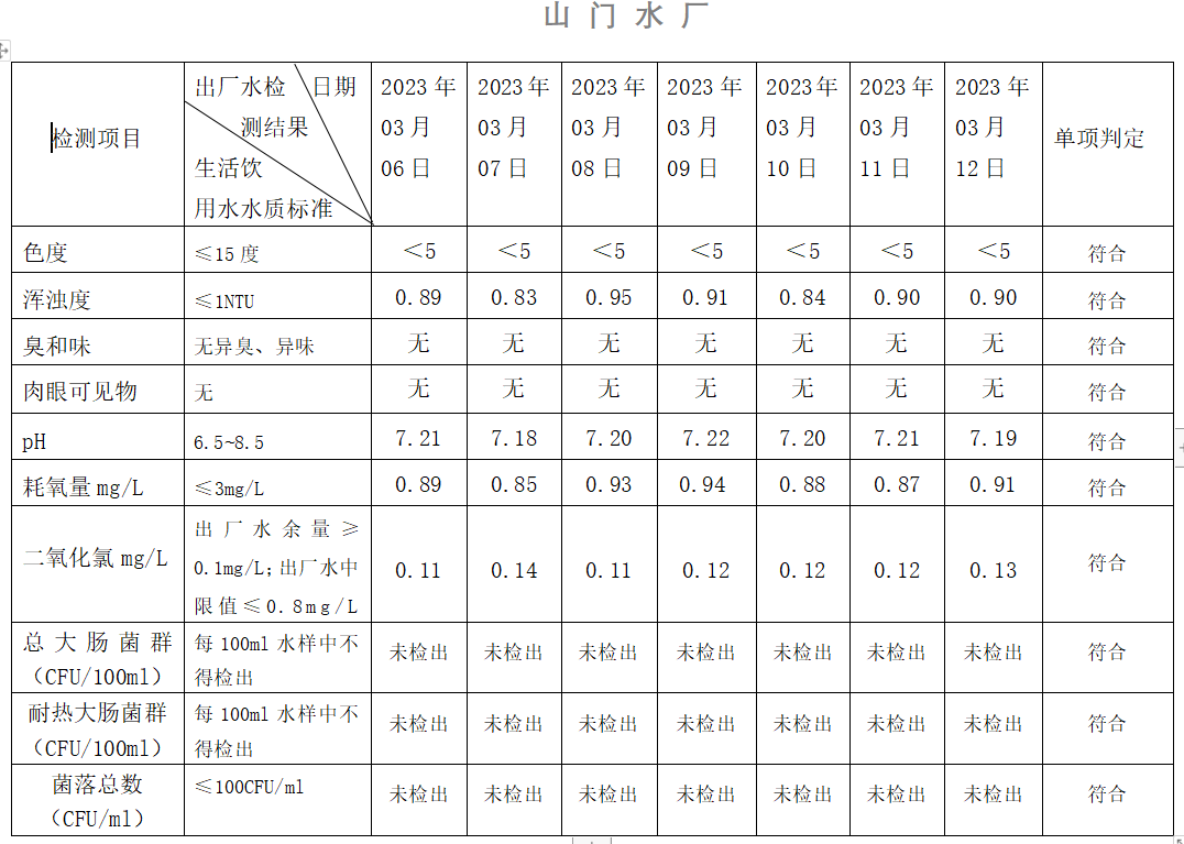 2023年03月06日-03月12日出廠(chǎng)水水質(zhì)日檢指標(biāo)公告