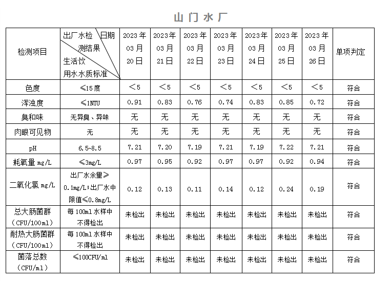 20223年03月20日-03月26日出廠水水質(zhì)日檢指標公告