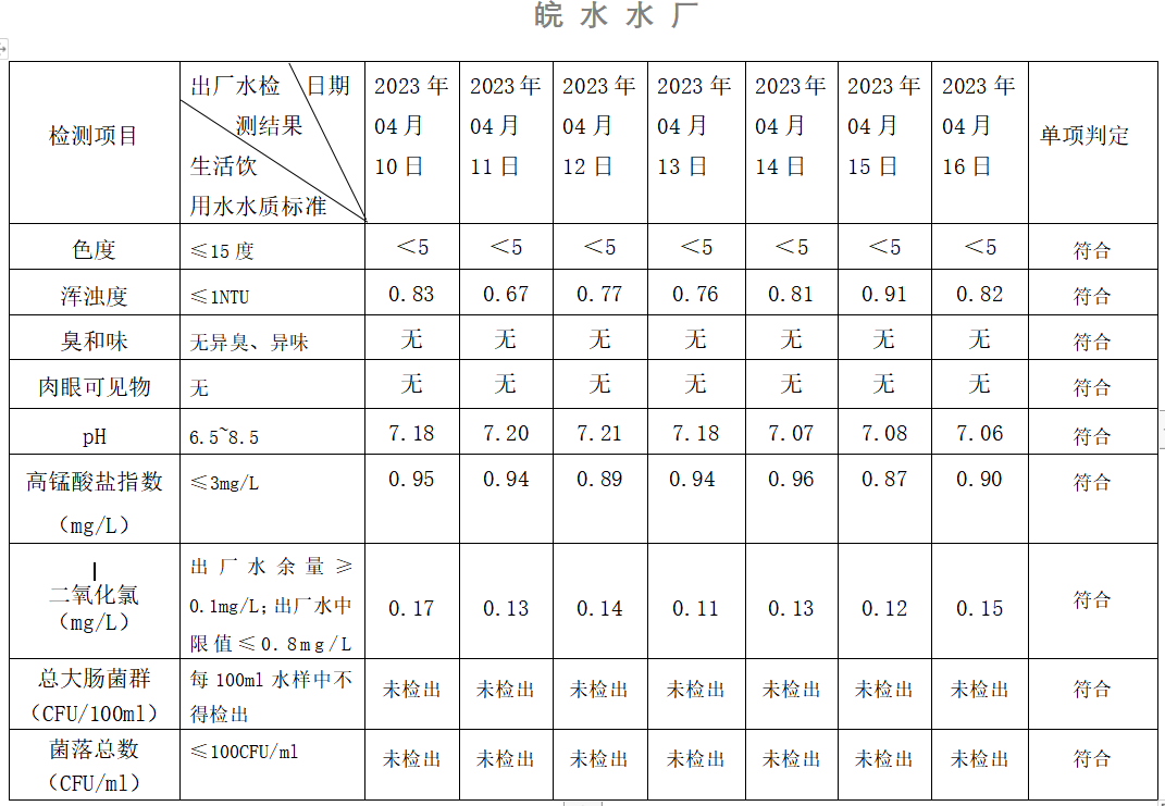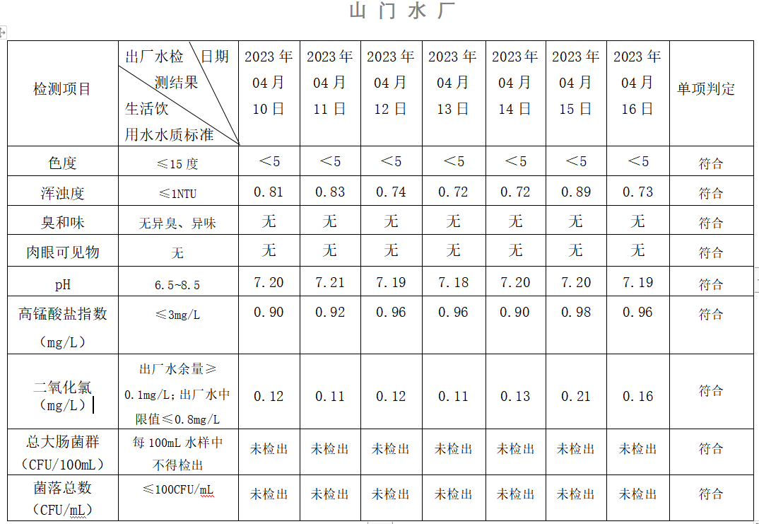 2023年04月10日-04月16日出廠水水質(zhì)日檢指標公告