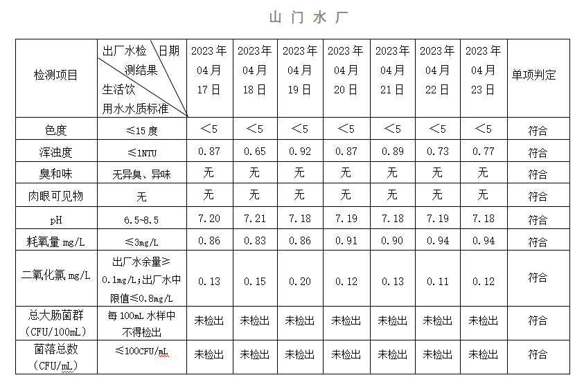 2023年4月17日-4月23日出廠水水質(zhì)日檢指標(biāo)公告
