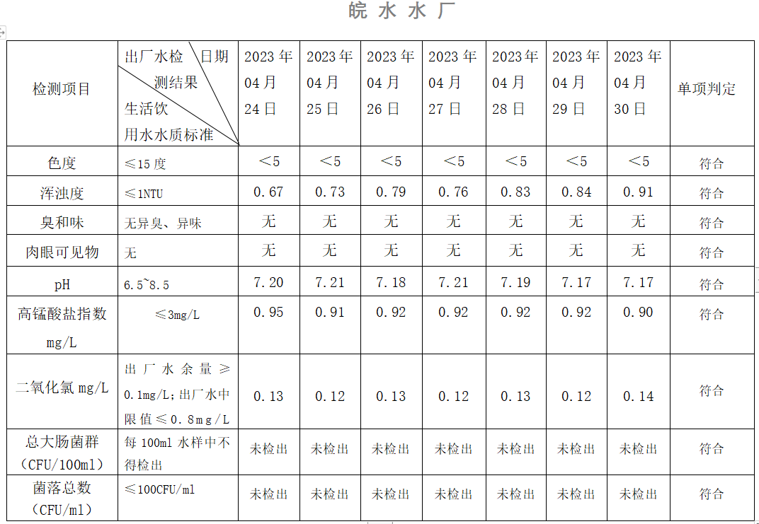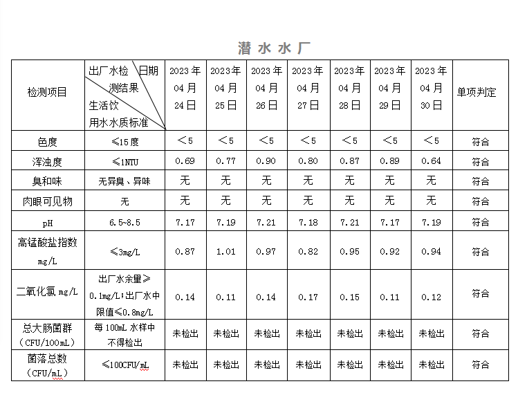 2023年04月24日-04月30日出廠水水質(zhì)日檢指標(biāo)公告