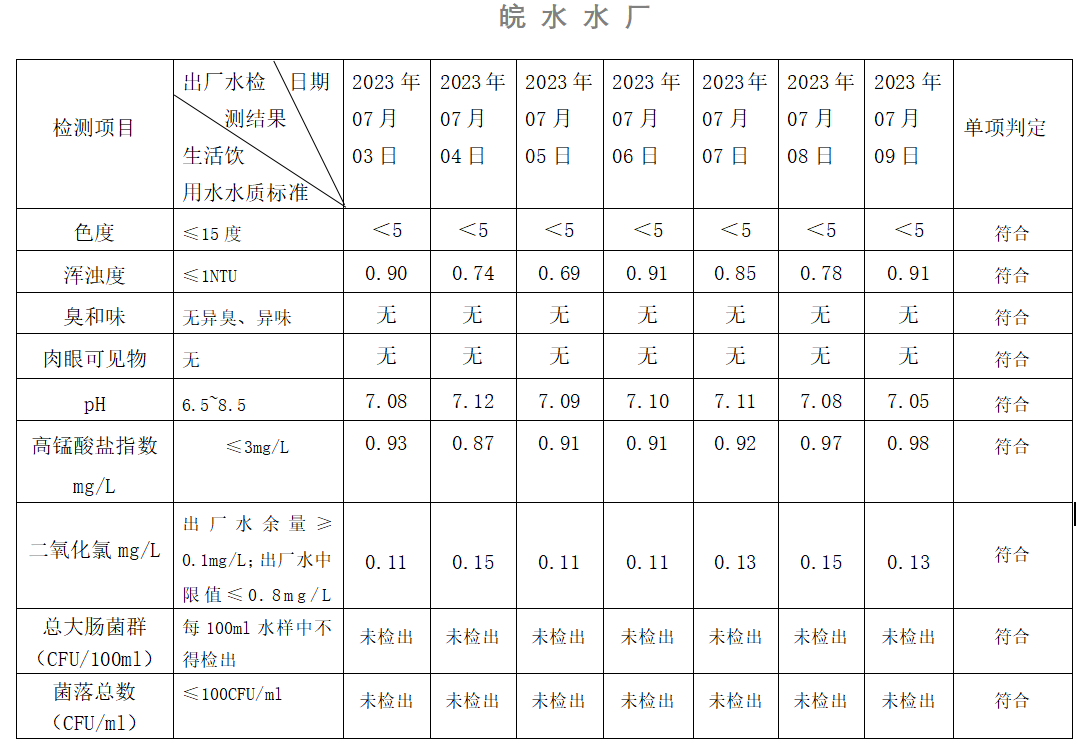 2023年07月03日-07月09日出廠水水質(zhì)日檢指標公告