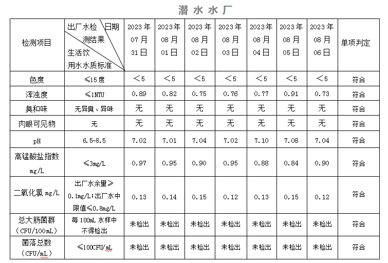 2023年07月31日-08月06日出廠水水質(zhì)日檢指標公告