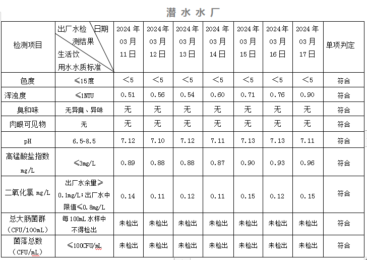2024年03月11日-03月17日出廠水水質(zhì)日檢指標(biāo)公告