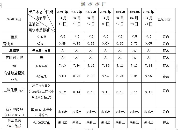 2024年04月15日-04月21日出廠水水質日檢指標公告