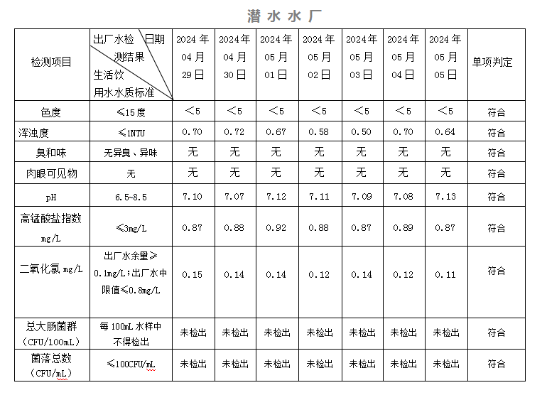 2024年04月29日-05月05日出廠水水質(zhì)日檢指標(biāo)公告