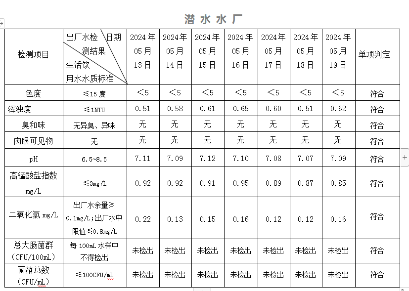 2024年05月13日-05月19日出廠水水質(zhì)日檢指標(biāo)公告