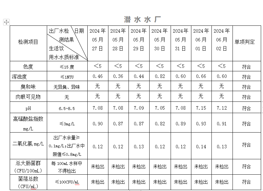2024年05月27日-06月02日出廠水水質(zhì)日檢指標公告