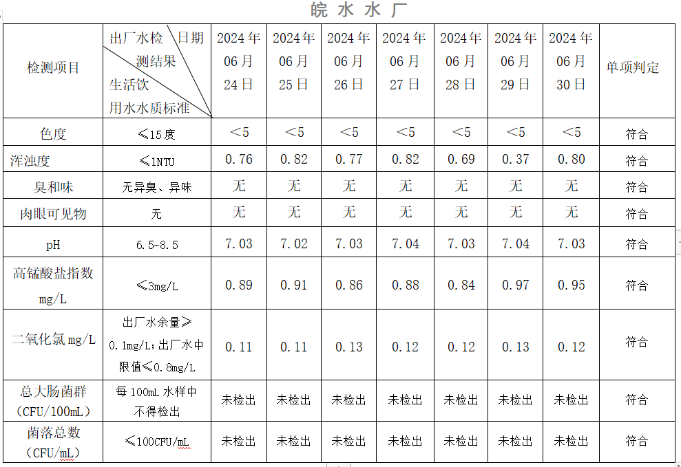 2024年06月24日-06月30日出廠水水質(zhì)日檢指標(biāo)公告