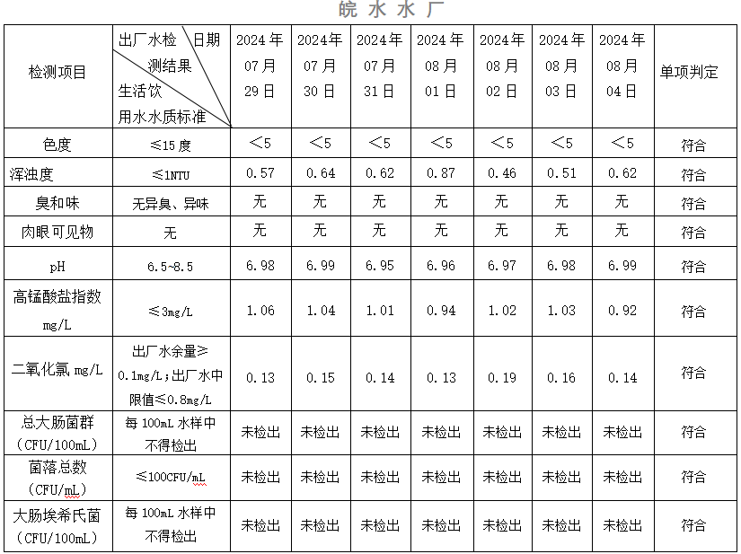 2024年07月29日-08月04日出廠水水質(zhì)日檢指標公告
