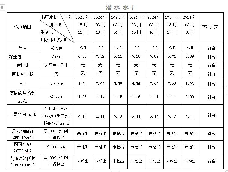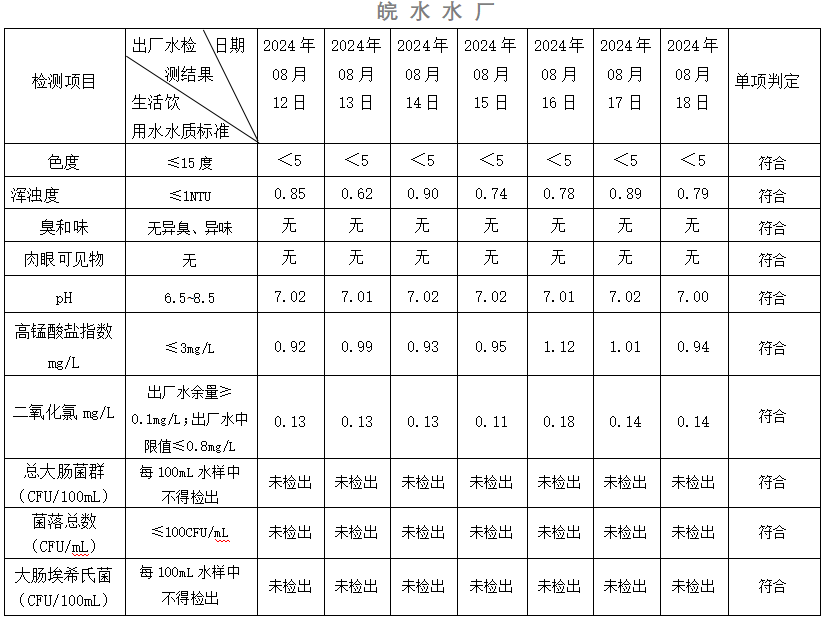 2024年08月12日-08月18日出廠水水質(zhì)日檢指標公告