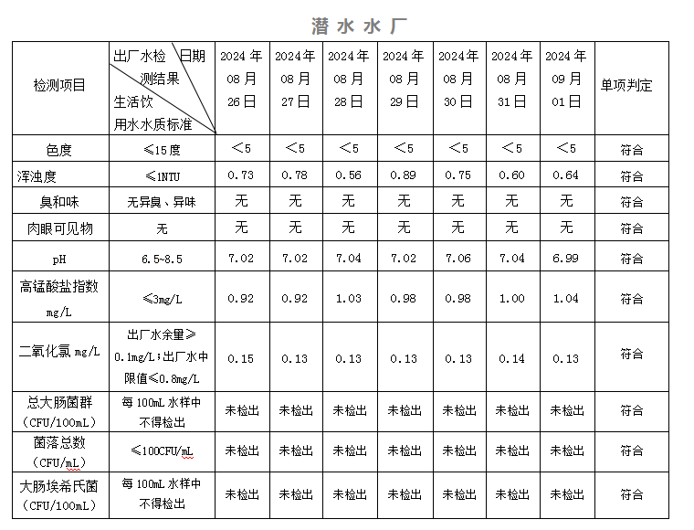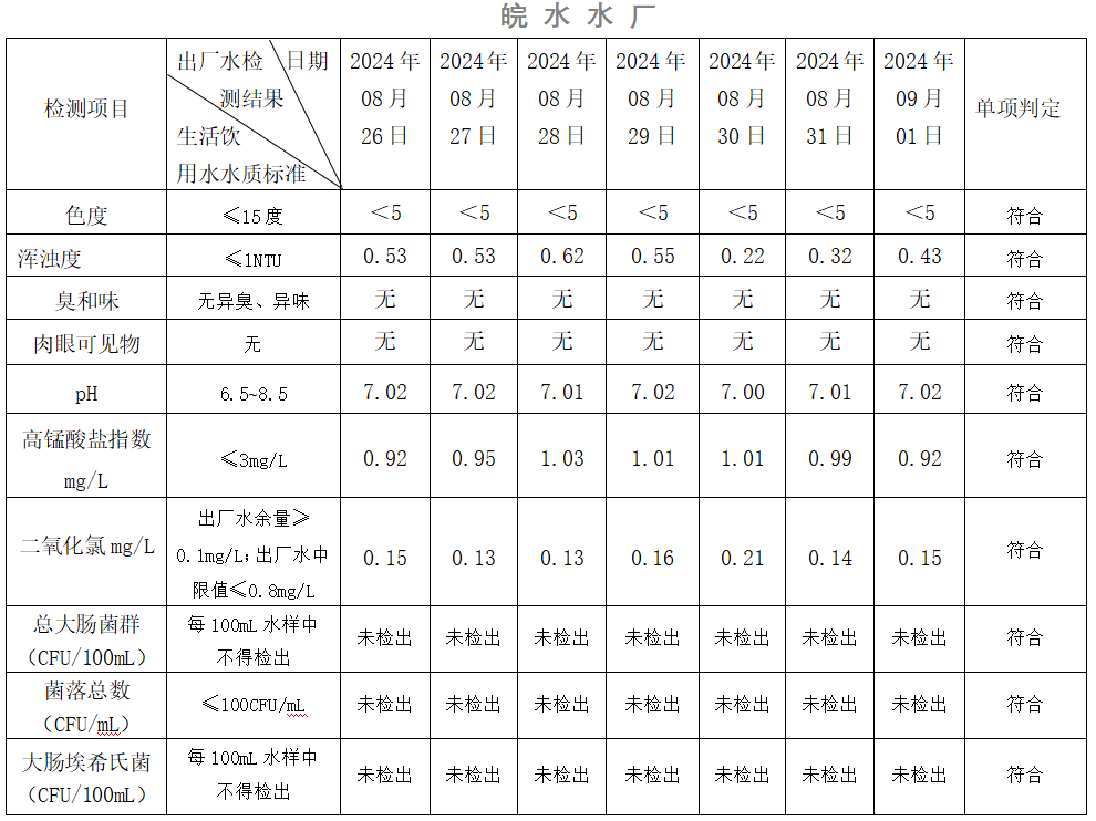 2024年08月26日-09月01日出廠水水質(zhì)日檢指標(biāo)公告