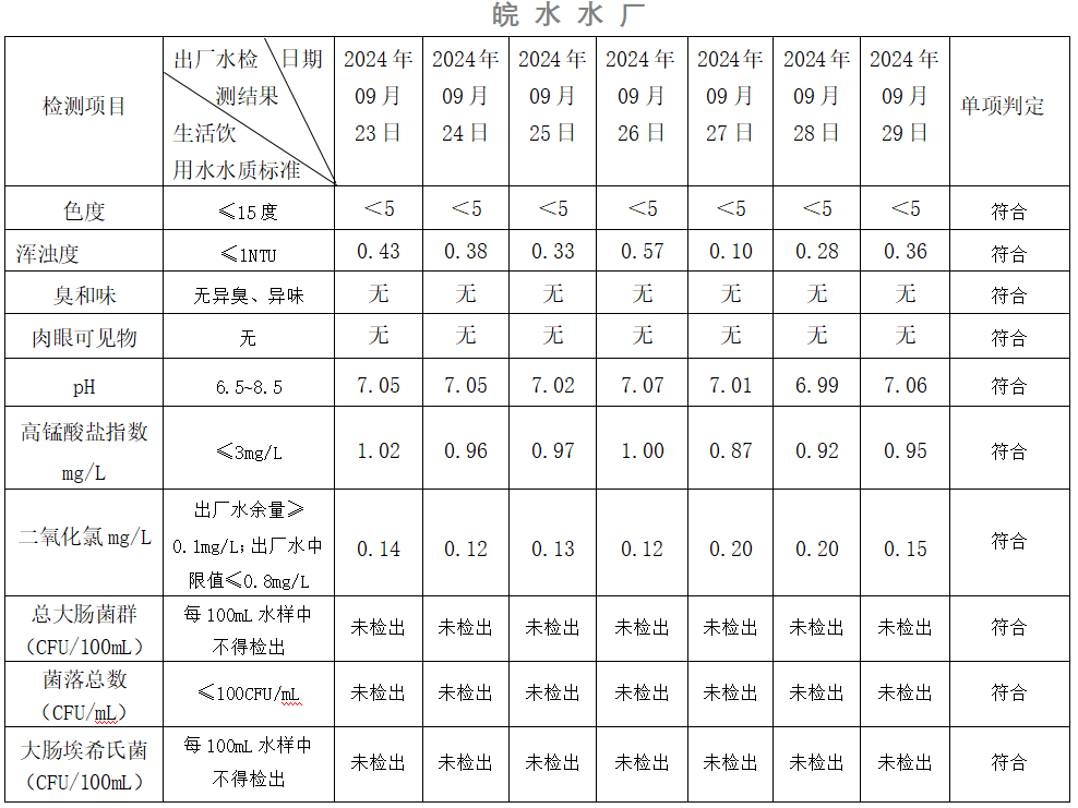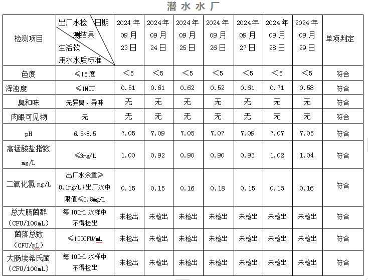 2024年09月23日-09月29日出廠水水質(zhì)日檢指標(biāo)公告