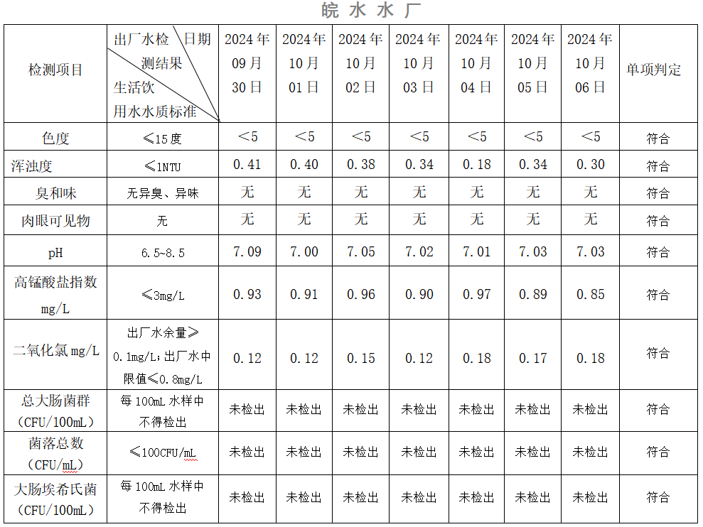 2024年09月30日-10月06日出廠水水質(zhì)日檢指標(biāo)公告
