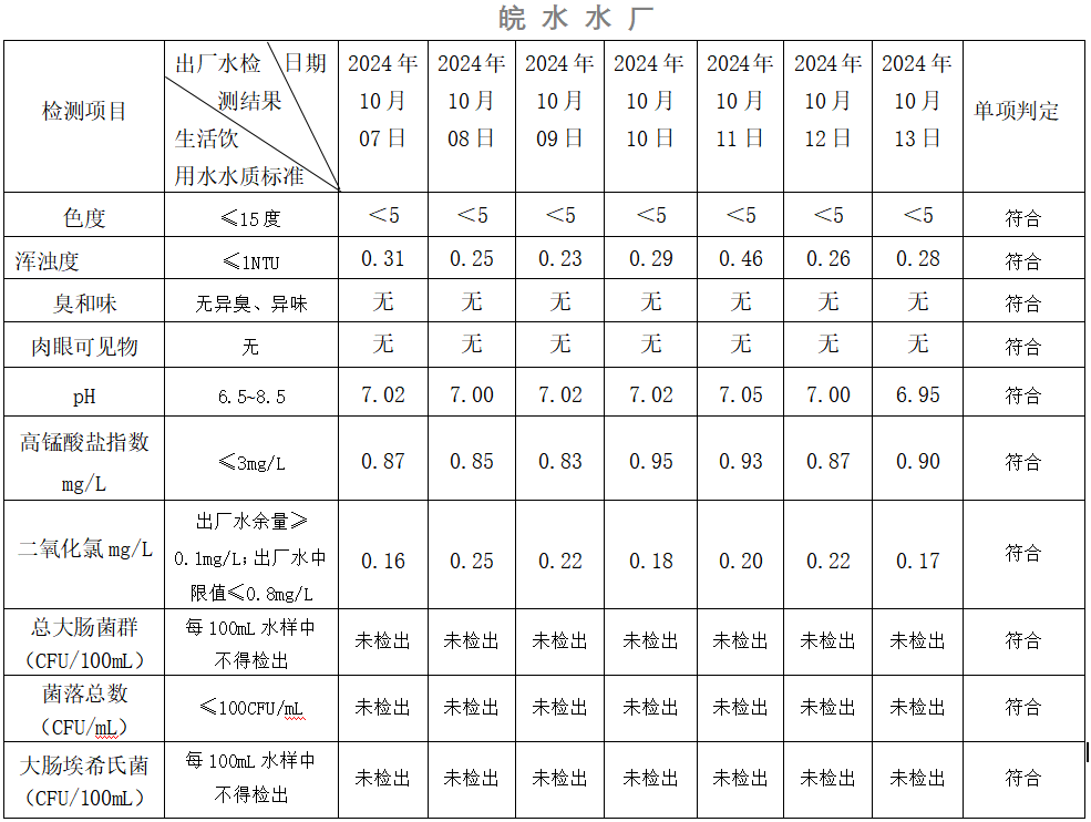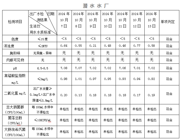 2024年10月07日-10月13日出廠水水質(zhì)日檢指標(biāo)公告