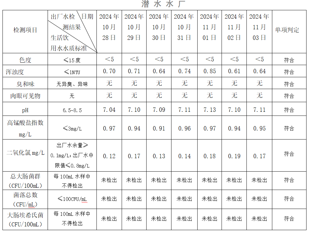 2024年10月28日-11月03日出廠水水質(zhì)日檢指標公告