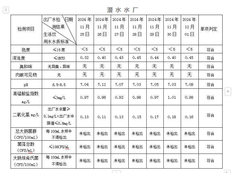 2024年11月25日-12月01日出廠水水質(zhì)日檢指標公告