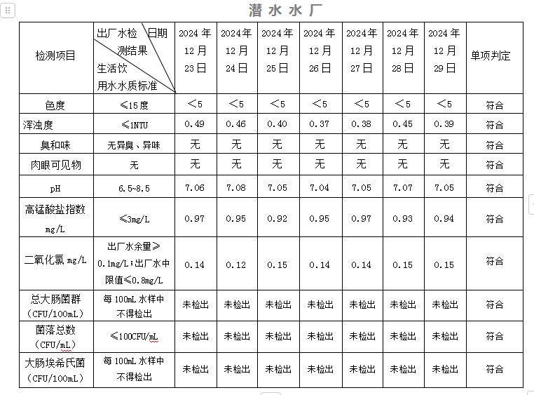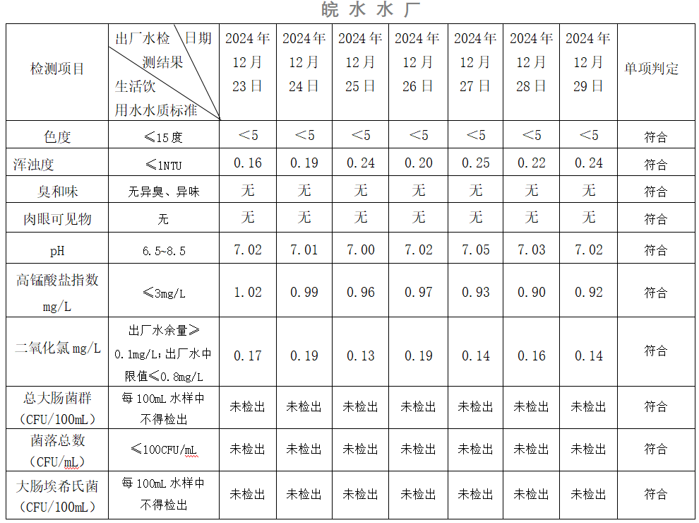 2024年12月23日-12月29日出廠水水質(zhì)日檢指標公告