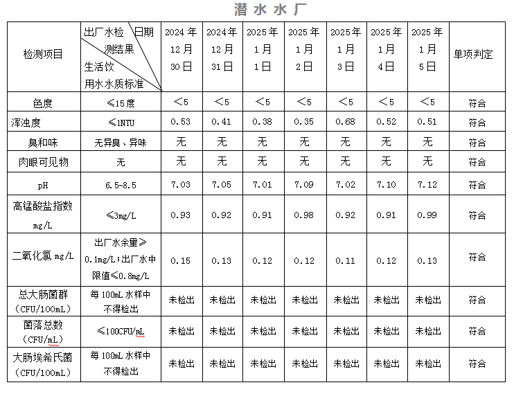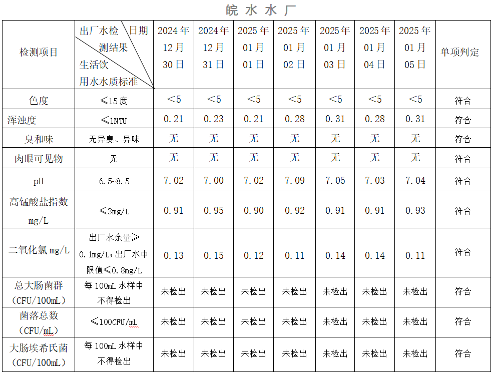 2024年12月30日-2025年01月05日出廠水水質(zhì)日檢指標(biāo)公