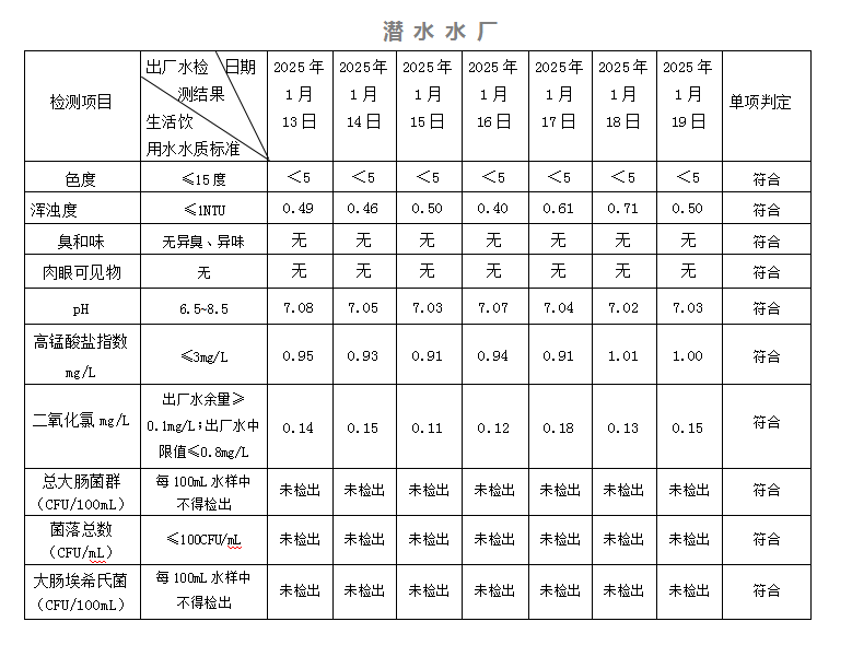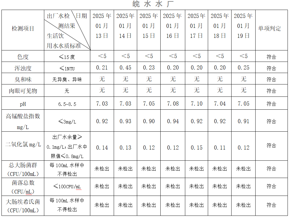 2025年01月13日-01月19日出廠水水質(zhì)日檢指標(biāo)公告