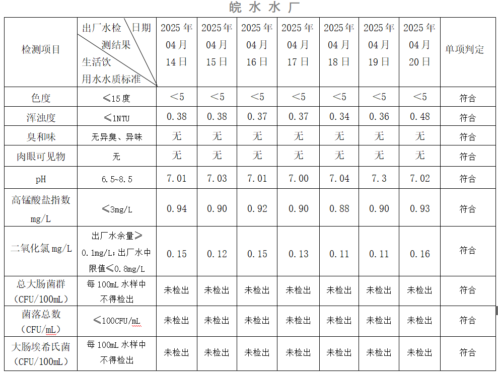 2025年04月14日-04月20日出廠水水質(zhì)日檢指標(biāo)公告