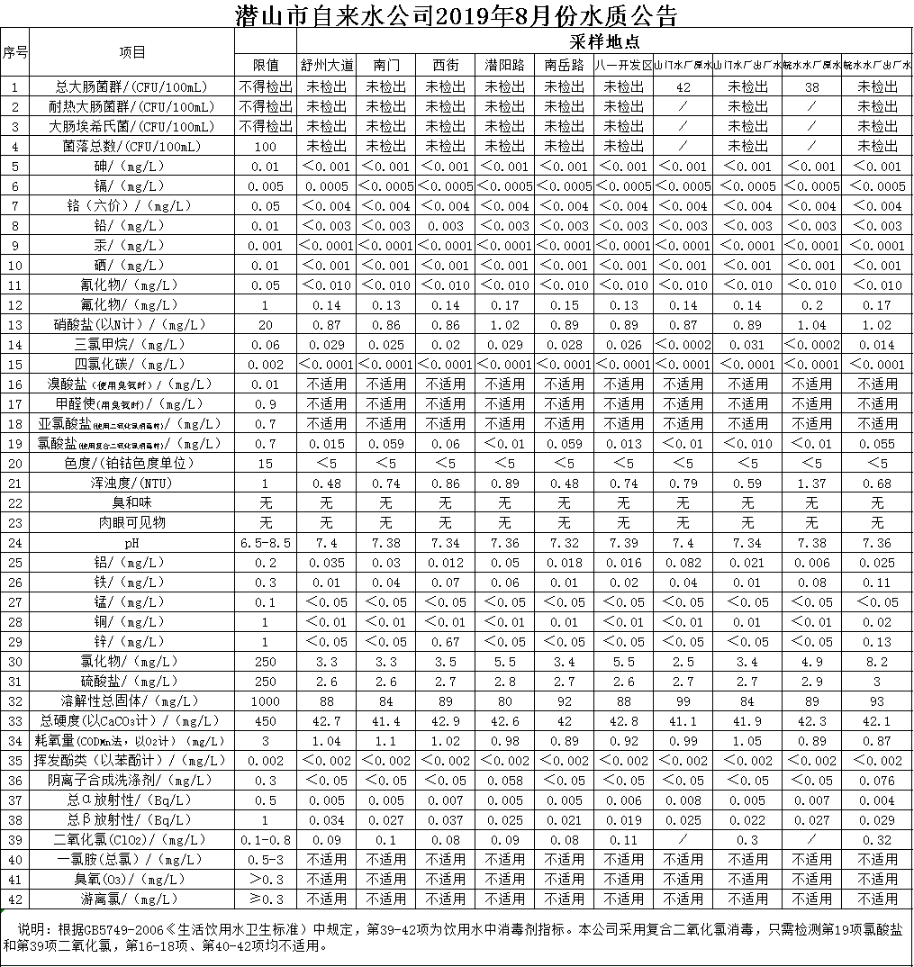 2019年8月份水質(zhì)分析:管網(wǎng)水、出廠水質(zhì)指標均符合國家《生活飲用水衛(wèi)生標準》。