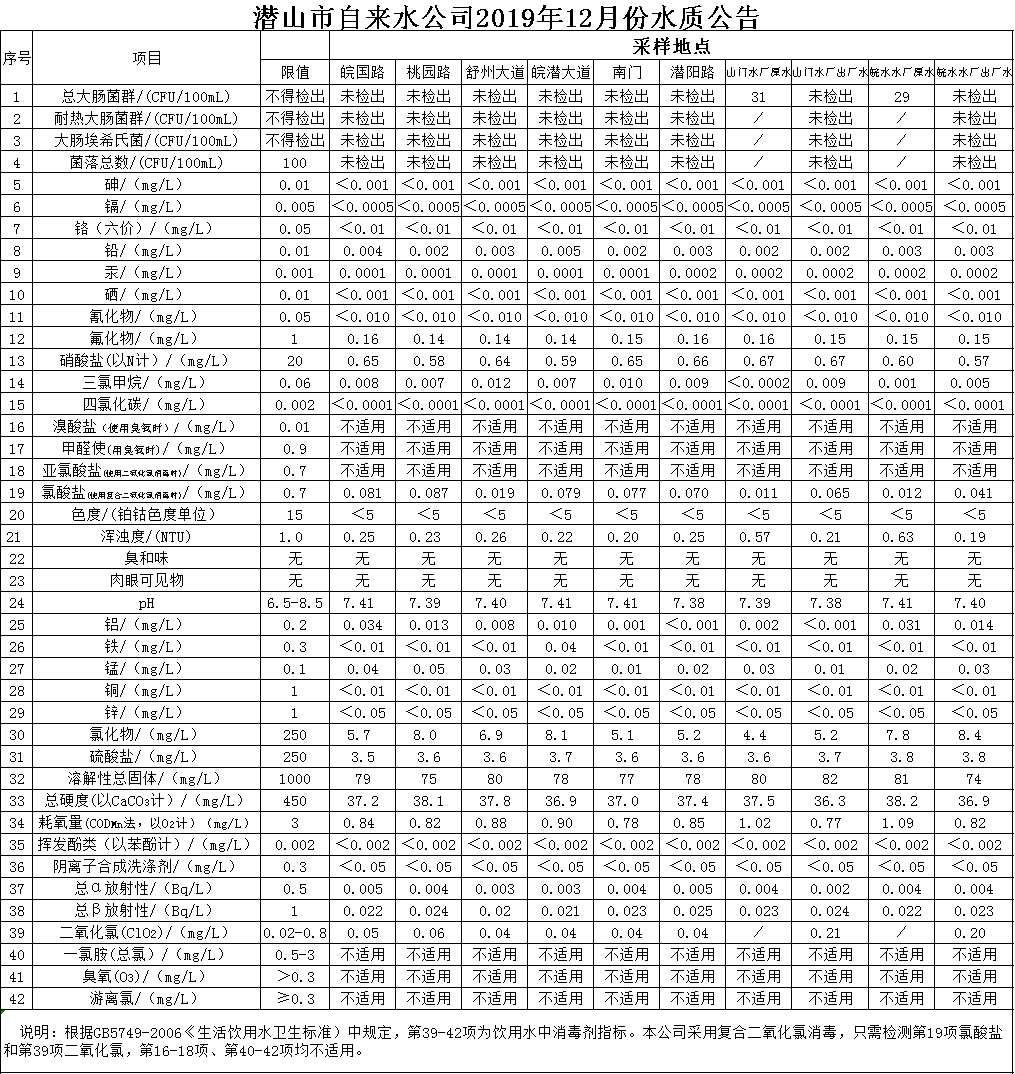 2019年12月份水質(zhì)分析:管網(wǎng)水、出廠水質(zhì)指標(biāo)均符合國家《生活飲用水衛(wèi)生標(biāo)準(zhǔn)》。