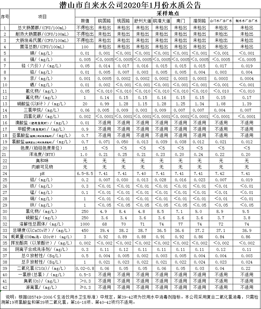 2020年1月份水質(zhì)分析:管網(wǎng)水、出廠水質(zhì)指標(biāo)均符合國家《生活飲用水衛(wèi)生標(biāo)準(zhǔn)》。