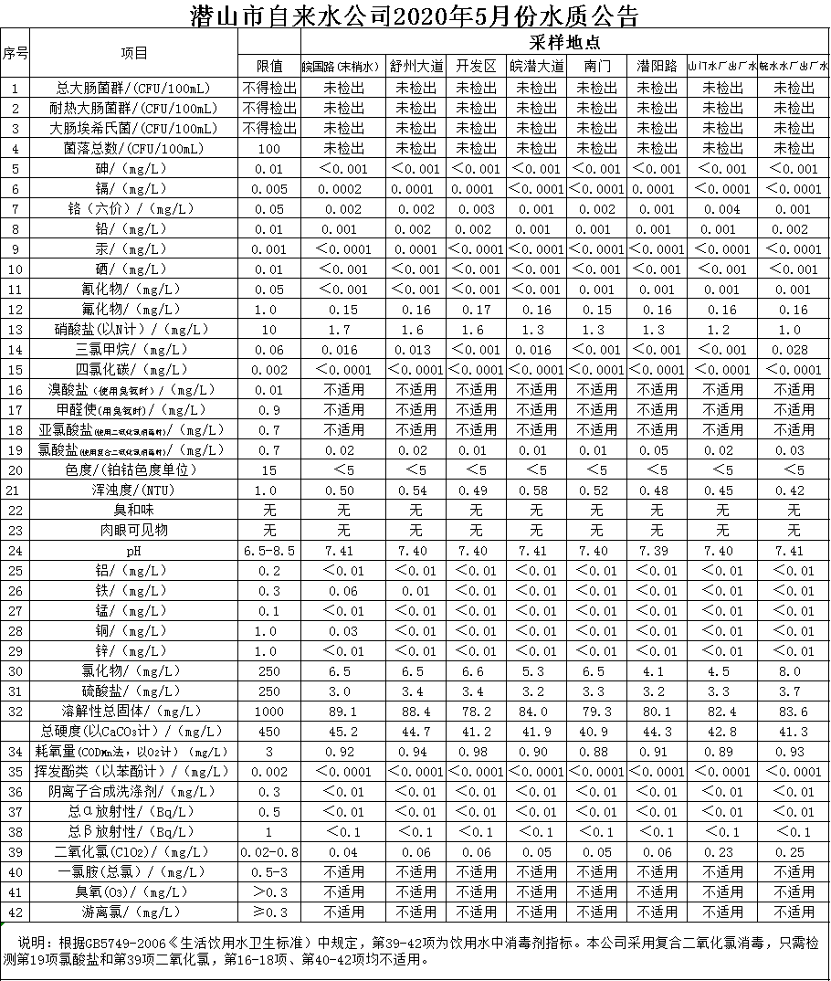2020年5月份水質(zhì)分析:管網(wǎng)水、出廠水質(zhì)指標均符合國家《生活飲用水衛(wèi)生標準》。