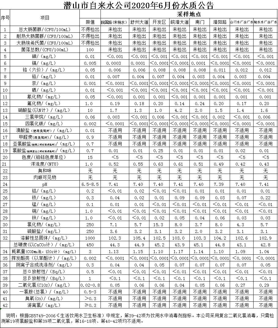 2020年6月份水質(zhì)分析:管網(wǎng)水、出廠水質(zhì)指標(biāo)均符合國家《生活飲用水衛(wèi)生標(biāo)準(zhǔn)》。